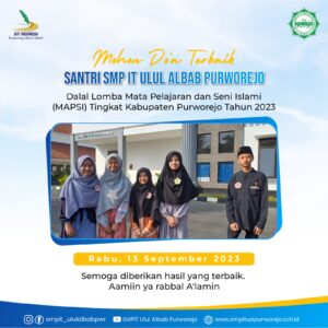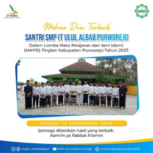 Semoga dengan partisipasi perlombaan MAPSI (Mata Pelajaran Agama dan Seni Islam) siswa/siswi SMPIT Ulul Albab Purworejo bisa menjadi salah satu sarana mengantarkan kesuksesan dan keberkahan dalam berbagai pengalaman.